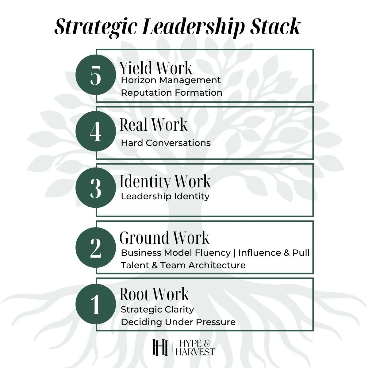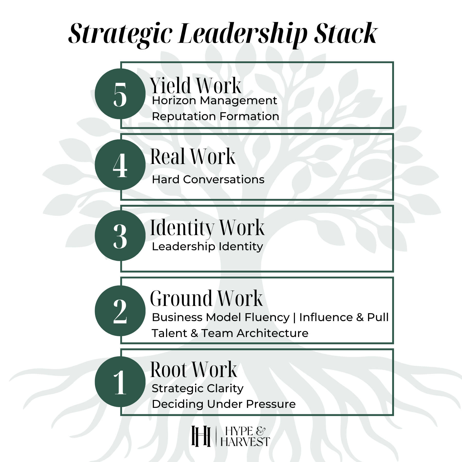 Our Strategic Leadership Stack™ integrates from the roots up — starting with strategic clarity and decision-making, through leadership identity, to organizational visibility and influence.